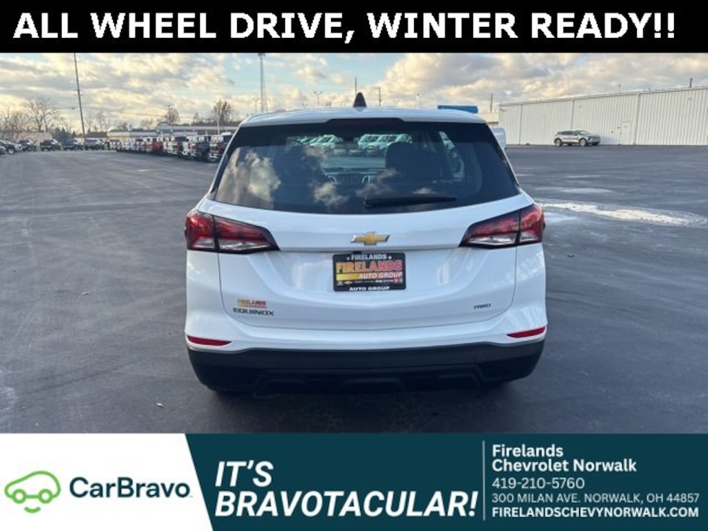 2024 Chevrolet Equinox LSCar Bravo Certified, 1-Owner, Great Price, Clean CarFax, Like New, 4WD / 4x4 / AWD, Navigation System, CarPlay, Android Auto, Bluetooth, Backup Camera, Steering Wheel Controls, Cruise Control, Keyless Start, Keyless Entry, Premium Audio, Satellite Radio, 4D Sport Utility, 1.5L DOHC, 6-Speed Automatic Electronic with Overdrive, AWD, Summit White, All-Weather Floor Liners (LPO), Floor Liner Package (LPO), Integrated Cargo Liner (LPO), Preferred Equipment Group 1LS.Clean CARFAX. CARFAX One-Owner.AWD 1.5L DOHC 6-Speed Automatic Electronic with OverdriveOdometer is 3006 miles below market average! 24/30 City/Highway MPGWelcome to the Firelands Family!! We understand that you donât want to come to a dealership and play games for hours. Thatâs why we focus on a few key principles: Be Really Fast Be Really Friendly, Be Really Fun, Be Really Honest. The price you see is the price you pay; plain and simple! We price our cars NOT our customers and hope that you have fun when you are here. We will never advertise misleading or confusing payments thatâs not our style. Rather, we hope to give you the best retail experience possible; after all: we LIVE off repeat and referral business. Our Vehicle Specialists are NOT paid on the profit (or loss) of a vehicle. You have DIRECT access to our Sales and Finance Managers cell phone numbers. We canât wait to put our best foot forward and have you leave smiling for years to come!